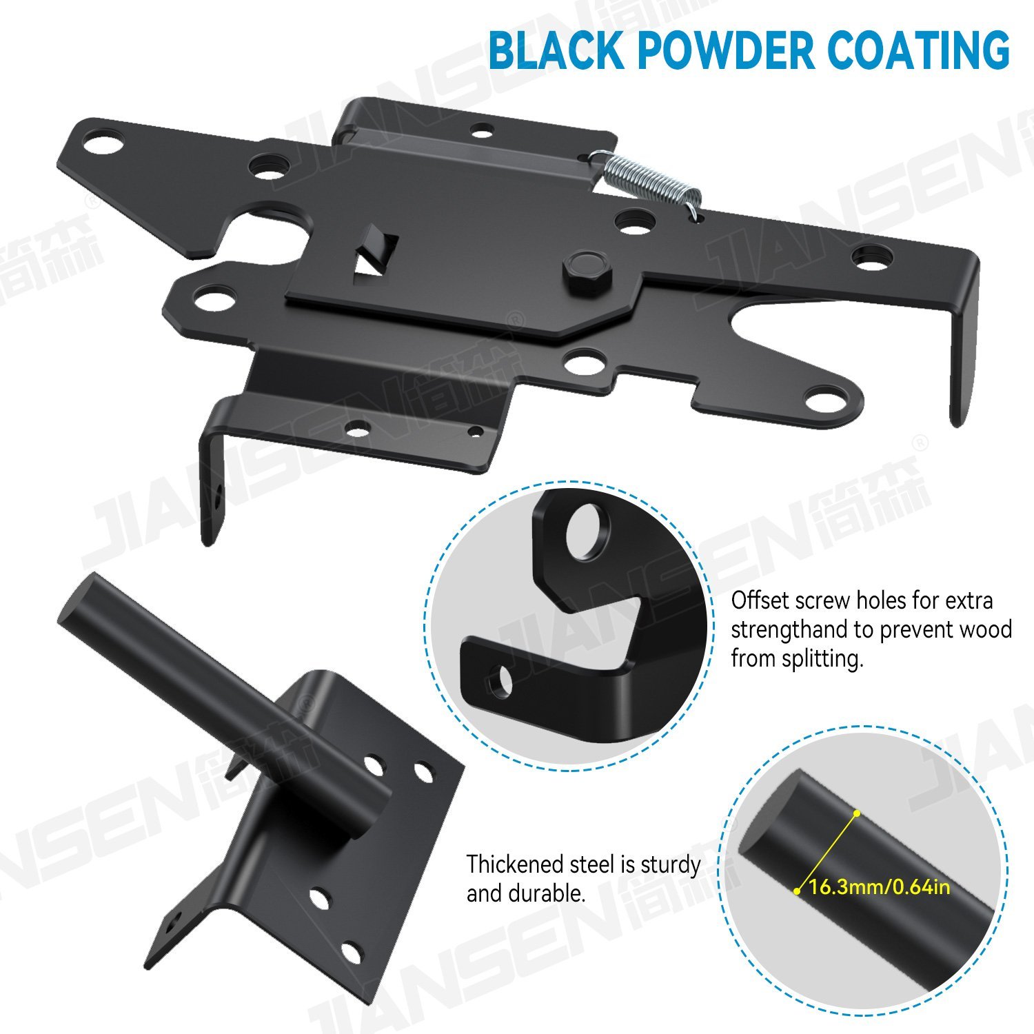 Galvanized treatment effectively prevents the Stainless Steel Fence Gate Latch from being eroded by environmental humidity, rain and chemical substances, and greatly extends the service life. The black powder coating is not only beautiful, but also further increases the ability to prevent rust and corrosion, ensuring that the Stainless Steel Fence Gate Latch remains bright as new in bad weather conditions. At the same time, black as a classic and low-key color, can be well integrated into a variety of environments.