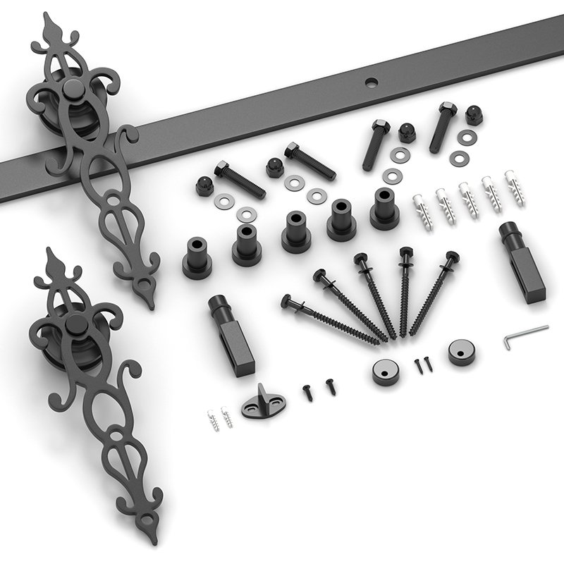 Sliding Barn door track; Barn door roller with bolts; Barn door Stoppers; Lag Bolts and Spacers; Floor guide ; Anti-jump pads ; Installation Manual.