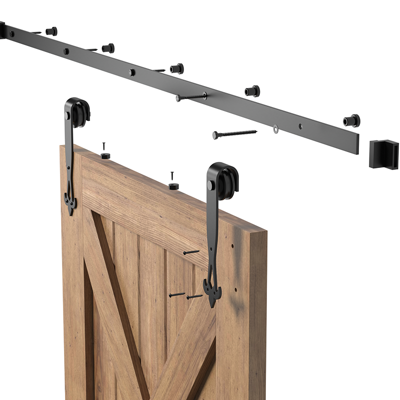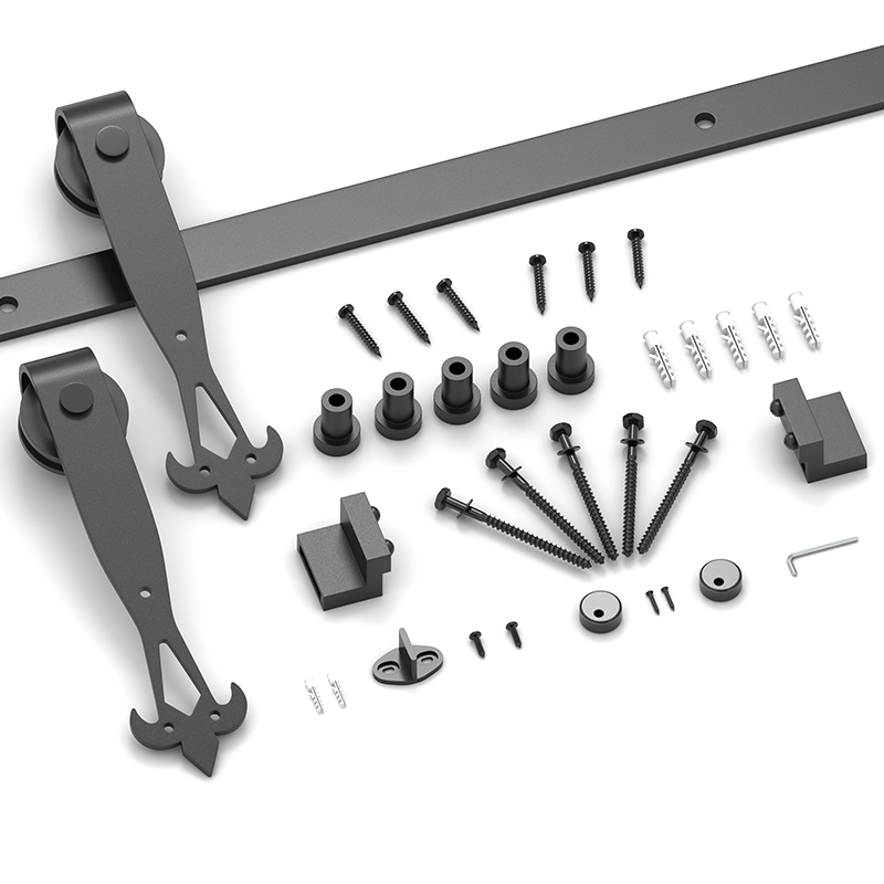 Sliding Barn door track; Barn door roller with bolts; Barn door Stoppers; Lag Bolts and Spacers; Floor guide ; Anti-jump pads ; Installation Manual.