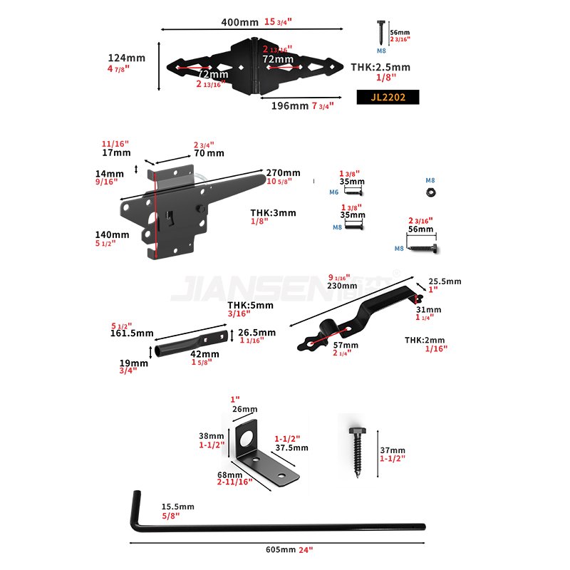 The primary function of Jiansen JL2234 wood fence hardware kit is to provide secure and easy access to a fenced area. The components in the kit work together to ensure that the fence gate opens and closes smoothly and stays securely latched when closed. The hinges, latch, lock, and handle are the most important components in the kit, as they enable users to operate the gate effortlessly.